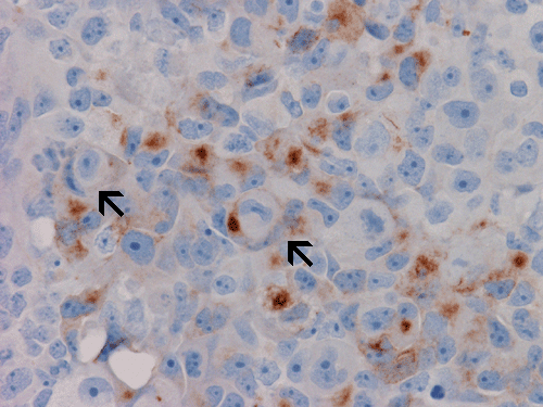 Immunohistochemistry, both classic, anaplastic, and large cell variants are similar. Immunoreactivity for synaptophysin can be demonstrated in most of the tumors. A small tumor that is negative for synaptophysin should raise a serious questions about the diagnosis of medulloblastoma. Expression of other markers such as neurofilament proteins, markers of photoreceptors, and glial fibrillary acidic protein (GFAP) can be seen. In contrast to glial tumors, mutation of p53 is quite uncommon. Isochromosome 17 is the most consistent genetic changes but it should not be used as a diagnostic tool. C-MYC gene amplification is also a common genetic alteration and has been shown to be related to anaplasia . Although studies have linked c-myc and N-myc gene overexpression with anaplasia and a poorer prognosis, this still appears somewhat controversial 5, 6, 7. Based on a study with gene expression profile 8, medulloblastoma with better prognosis are associated with expression of genes that influence cerebellar differentiation (incluing the TRKC and sodium channel gene) and extracellular matrix genes (including elastin and collagen type V gene). Expression of cell proliferation and gene metabolism (including MYBL2 and LDH) are associated with bad prognosis. Epithelial membrane antigen (EMA) is usually negative in medulloblastoma. The possibility of an atypical teratoid rhabdoid tumor (ATRT) should be considered when a medulloblastoma-like tumor with positive immunoreactivity for EMA must be considered. Expression of cytokeratin can be present in a spotty manner. Extensive expression of cytokeratin should raise the possibility of a metastatic carcinoma.