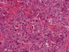 ATRT shares many features with large cell (anaplastic) medulloblastomas. First, most of them occur in infants and children but ATRT are a lot more common in children under three years of age. Both tumor are highly malignant. In fact, the rapid growth as documented in this case lead to the consideration of ATRT before surgery. Second, both entities are featured by large cells with large nuclei and prominent nucleoli. During frozen sections, it may be a difficult task to distinguish these tumors. The rhabdoid cells in ATRT my not be very characteristics and a medulloblastoma like component is not uncommon in ATRT. Also, the rhabdoid cells may not be that numerous and the pathologist has to search for them. The intraoperative cytologic preparations provide excellent cytologic and nuclear details. In general, cells of large cell medulloblastoma do not have the typical eccentric nuclei and cytoplasmic inclusion like bodies in comparison to ATRT. In addition, although the nucleoli are large, they are not as prominent and eosinophilic as in ATRT. Third, cells of ATRT tend to be more intact and large cell (anaplastic) medulloblastomas tend to have predominantly naked nuclei. Distinction of the two entities on permanent sections is usually not a major problem. It should be noted that ATRT are polyphenotypic. However, they are usually positive for EMA which is typically negative in medulloblastoma and its variants. The greatest help would be immunohistochemistry for BAF-47. This antibody recognizes the protein coded by INI1 gene which is the critical gene on chromoome 22q11.2. This gene is expressed in normal tissue as well as neoplastic tissue except in the tissue where this gene is deleted and ATRT is the prototype 9. In some cases of ATRT, the staining can be patchy. The genetic deletion can be confirmed by fluorescent in situ hybridization. In a minority number of cases, no chromosome 22q11.2 deletion is demonstrated. The gene can be sequence in order to search for mutation of the INI1 gene.