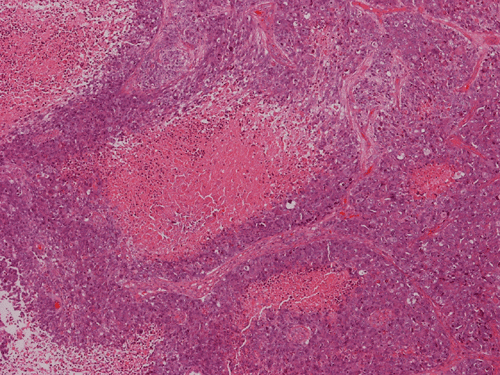 The volume of tissue received for examination amount to an aggregate of 4.0 x 2.0 x 1.5 cm in combined size. Grossly, the tissue is soft and has a creamy color with hemorrhage. The intraoperative cytologic preparation demonstrate a neoplasm composed with small to medium sized blue cells that smear out rather homgeneously and evenly. If you pay attention, there are some larger cells with a substantial amount of cytoplasm even at low magnification (Panel A). On high magnification, the nuclei are rather uniformly large, with high grade of pleomorphism, and almost all cells contain a distinct nucleoli. Apoptotic bodies and mitoses are frequent (Panel B). There are also large cells with prominent nucleoli and substantial amount of eosinophilic cytoplasm. These cells are suggestive of rhabdoid cells but none of them have the distinct inclusion body like cytoplasmic eosinophilic body of the rhabodid cells in atypical teratoid rhabodid tumor (Panel C). In the frozen section, both small to medium sized cells and cells with large nuclei with large, prominent, and eosinophilic nucleoli (Panel D and E). In the permanent sections, there is extensive necrosis (Panel F). The histology is in general agreement with that of frozen section except that the tumor cells appear to have more cytoplasm and more plemorphic, large nuclei with prominent nucleoli in comparison to the frozen section (Panel G). Large cells with substantial volume of cytoplasm, large, bizarre nucleoli and prominent, eosinophilic nucleoli are also noted (Panel H). There is a generalized degree of high grade pleomorphism. Results of immunohistochemistry are as follow: