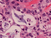 Mucous cells may be difficult to identify due to their scarcity, but their presence is required for the diagnosis. In cases suspicious of mucoepidermoid carcinoma but no obvious mucous secreting cells are found, mucicarmine stain is helpful in highlighting these cells. Entrapped mucus secreting cells should not be confused with neoplastic mucin secreting cells. Clear cells may be present and often contain glycogen and they appear like altered squamous cells.