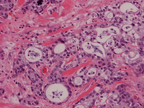 within the tumor. Individual and nests of mucin producing cells are well