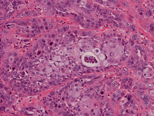 In some areas, the squamous differentiation is slightly obscure.The tumor cells