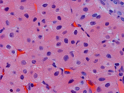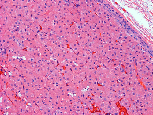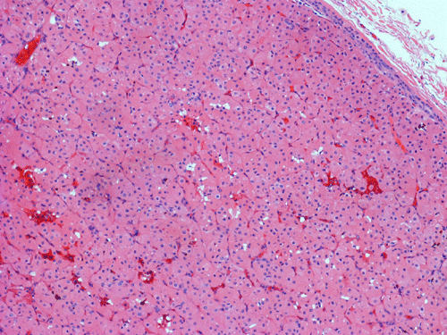 Microscopically, oncocytes have a very characteristic appearance with granular eosinophilic cytoplasm due to marked increase in the number of mitochondria mitochondria, pleomorphism of mitochondria, and a paucity of other organelles. The tumor cells have little variation among different tumors or different part of the same tumor. Characteristically, the tumor cells are rather uniform and polygonal in shape. The cytoplasmic membrane can be readily recognized. The nuclei are usually round, centrally located, and nucleoli are present. The cells are arranged in uniform solid sheets without a specific pattern or they may aggregate into clusters, and sometimes they form duct-like structures. Thin fibrovascular septa are present. Oncocytomas may have a clear cell component secondary to accumulation of cytoplasmic glycogen 6. A PAS stain with and without diastase digestion will be very helpful in recognizing the glycogen. High grade nuclear atypia is only seen exceptionally. Phosphotungstic acid hematoxylin (PTAH) is a good stain that would stain the mitochondria dark. However, the stain is rarely called to service for this purpose as the cytoplasm is typically characteristic enough for recognition without special stain. In clear cell variants, however, PTAH may help. Mitotic figures are not readily seen. In most situations, the diagnosis of oncocytoma is not a particularly challenging one.