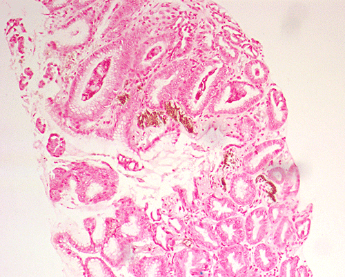 Gastric mucosal calcinosis is not typically associated with symptoms, although there are rare case reports of dyspepsia and epigastric pain that could not be explained by other causes 14, 15. Thus, gastric calcinosis will most commonly be an incidental finding on biopsy. As mentioned above, it is important for the pathologist to report the finding in biopsies because of the association with metastatic calcification in critical organs.