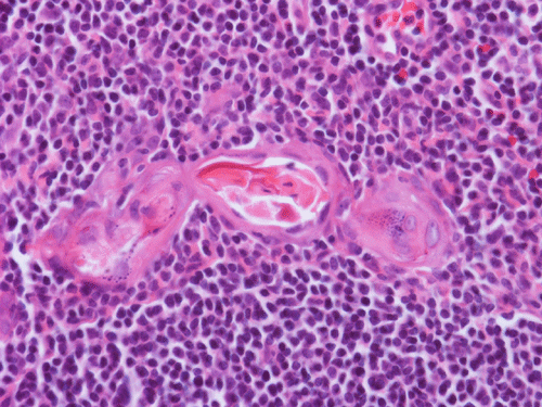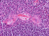 Clinical information: The patient is a 36 year-old woman who presented with a 2 cm swelling in the left side of her neck. The mass was not tender, warm, or painful. The overlying skin was unremarkable. A CT scan was performed and showed a 1.8 x 1.2 cm relatively non-enhancing lesion within the carotid sheath displacing the carotid artery anterioriorly. The clinical and imaging features yielded an empirical diagnosis of an enlarged lymph node. The patient had no history of lymphoma, leukemia, or head and neck tumor. The mass was removed surgically in its entirety and was 2.5 cm in maximum dimension, well encapsulated, located at the level of the carotid bifurcation just lateral to the carotid artery and superiorly extending almost up to the level of the tonsils. The mass did not appear to be in continuity with the jugular vein or the carotid artery. It was not a part of the vagus nerve or sympathetic chain. The followings are representative images.