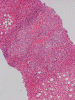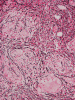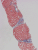 Histopathologic features of sarcoidosis include scattered granulomas in the liver, which may tend to be portal or periportal. Multinucleated giant cells, epithelioid cells, and a variable but usually minimal inflammatory cellular response is present. The granulomas, like in sarcoidosis occuring in other organ systems, tend to be well-demarcated or "clear cut", several granulomas are often comparable in size, and necrosis is not typically present. Asteroid bodies, intracellular vacuolated structures resembling a sea anemone, may be found within the giant cells. Large basophilic, round to roughly oval, and concentrically laminated, Schaumann bodies may be evident in the sarcoid granuloma. None of these inclusions are pathognomonic feature of sarcoidosis, however, do suggest this diagnosis. Ductopenia, cholestasis and features of chronic cholestasis resembling PBC have been described in the cases of sarcoidosis. Severe fibrosis and cirrhosis in conjunction with portal hypertension may be present in sarcoidosis. End stage liver disease in sarcoidosis has been successfully treated by orthotopic liver transplant and recurrent disease has been reported in one such case. Reticulin fibers has a tendency to extend into the granulomas as illustrated in this case.