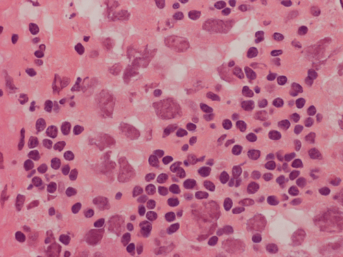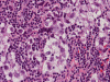 The discussion here will be limited predominantly to germinoma. Histologically, germinoma has very characteristic features heralded by large, atypical germinoma cells in a background of benign lymphocytes. The germinoma cells are usually huge, with a moderated amount of cytoplasm, and with prominent nucleoli. These cells, even though large, are rarely bizarre. The proportion of germinoma cells with lymphocytes can be highly variable. While most cases show a good mix of both component, the small biopsies yielded by endoscopic biopsy can sample in areas that are lymphocyte predominant or germinoma cell predominant areas which lead to diagnostic pitfalls. It should also be reminded that germinoma has a strong tendency to undergo granulomatous changes. Such granulomatous changes may completely efface the usually big cell-small lymphocyte classic pattern. These biopsies, however, would histologically suggest infection but the clinical history usually would not. Knowing the clinical history is often helpful. Trophoblastic cells could be seen and their presence may indicate a worse prognosis for germinomas. Non-seminomatous component such as embryonal cell carcinoma, yolk sac tumor (endodermal sinus tumor), and choriocarcinoma should also be identified if present.