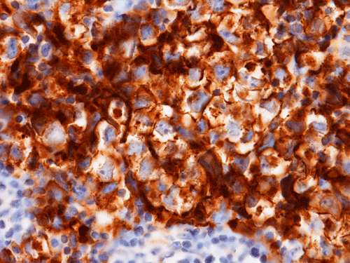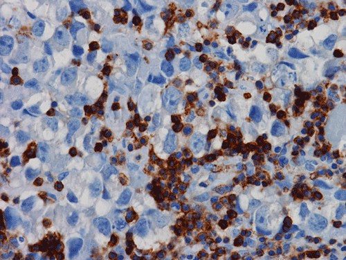 The germinoma cells are positive for several immunohistochemical markers. These adjuncts are helpful for confirming the diagnosis or when the tumor is composed largely of the large, atypical germinoma cells. The germinoma cells are positive for placental alkaline phosphatase (PLAP) and OCT4 6. They are also positive for CD117 (c-kit) but it should be noted that CD117 is not as specific as PLAP or OCT4.