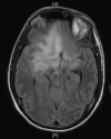 Clinical information: The patient was a 40 year-old man with a history of headache for months and suddenly develop nausea and vomiting in the morning. MRI demonstrated a diffusely infiltrative, non-enhancing lesions that dominated the right frontal lobe with extension across the genu of the corpus callosum into the left frontal region. The lesion also extended in occipital direction to the right basal ganglia, sub-insular region, and anterior temporal lobe. A resection was performed. The followings are representative images: