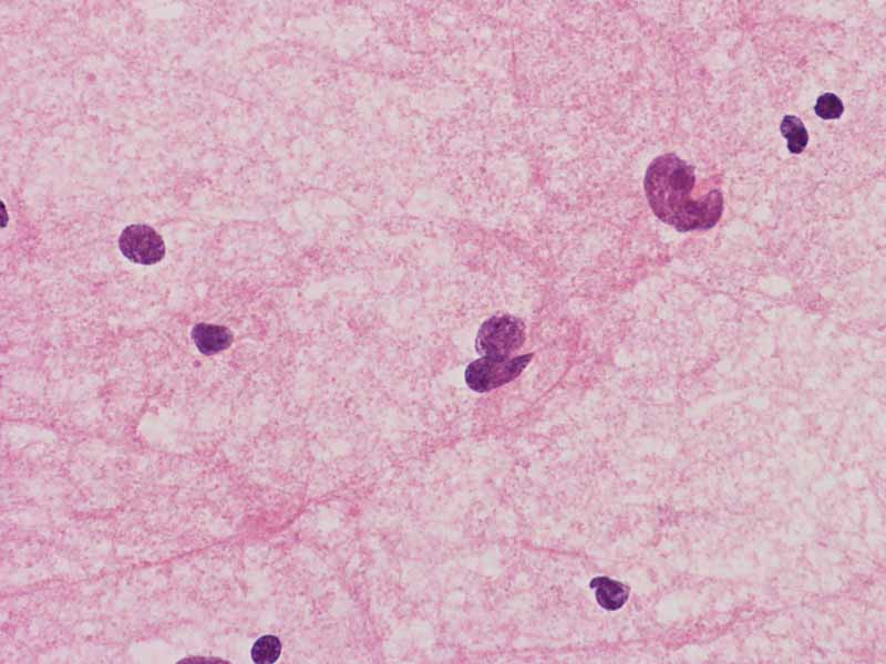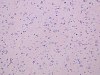 In this particularly case, there are areas with high cellularity and low cellularity. However, the cellularity in areas where I call it high cellularity is not really high among astrocytic tumors an glioblastomas. In cases that have growth pattern of what formerly known as gliomatosis, areas with a distinctly high cellularity may not even exists. When a stereotactic biopsy is often employed as the diagnostic procedure and the sample is obtained from an area with low cellularity, the situation can be quite challenging. Knowning the clinical history and imaging well, a high index of suspicious, and morphology based deligent study of the slides are still the key to a correct diagnosis. Although the number of infiltrating cells are low, the large atypical cells can still be recognized by morphologic criteria. Cytologic preparation typically preseve the cellular details well is particularly useful. As illustrate from an image from a different case, the dramatic different between the large atypical cells and the more normal looking cells is dramatic even though the cellularity is low [click here to see an intraoperative cytologic preparation].