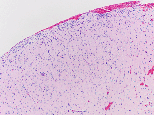 material, there is extensive infiltration of tumor cells in the gray matter with