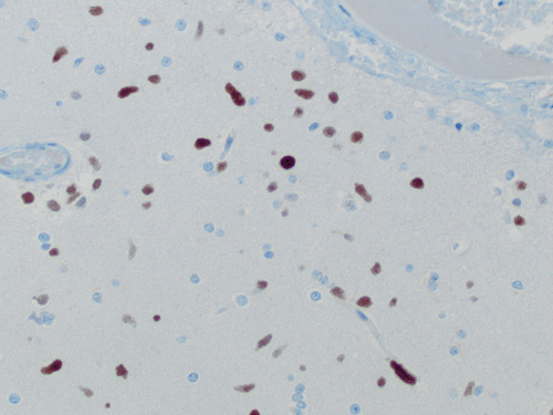 In small stereotactic biopsy with a low density of infiltrating glioma cells, immunohistochemistry can be used to confirm the diagnosis. In the experience of the author, Ki67 is the most useful one as it would light up the atypical cells. When Ki67 is used for this purpose, one must know that some reactive condition can lead to also a modest increase in Ki67 positive cells but these cell should not have the enlarged and atypical nuclei. Also, gliomas do not tend to have as high labeling index as medulloblastoma. The lack of Ki67 positive is not full prove for the absence of cancer. Immunohistochemistry for IDH1-R132H can be used to light up the tumor cells and this one is rather specific. Also, it lights up most if not all tumor cells so the problem that only some tumor cells are labeled by immunohistochemistry for Ki67 would not happen here. However, gliomas in older patients are often negative IDH mutation and negative for IDH1-R132H. When the tumor density is too low, molecular testing of IDH1 and IDH2 mutation will not be helpful as it would be below the detection limits.