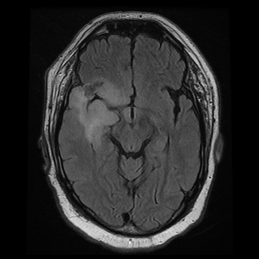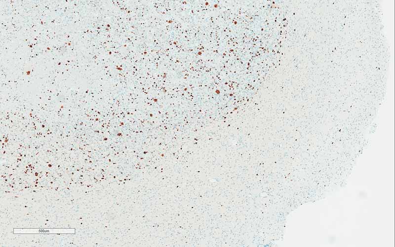 Clinical information: The patient was a 76 year-old man with a history of Parkinson's disease. He developed sudden onset weakness of lower extremities while standing. He did not fall and was able to sit down. There was a brief tremor of his upper extremities but there was no seizure. On furhter work up, an enhancing mass, 2.0 x 1.6 cm, was noted in his right temporal pole. The mass was resected.