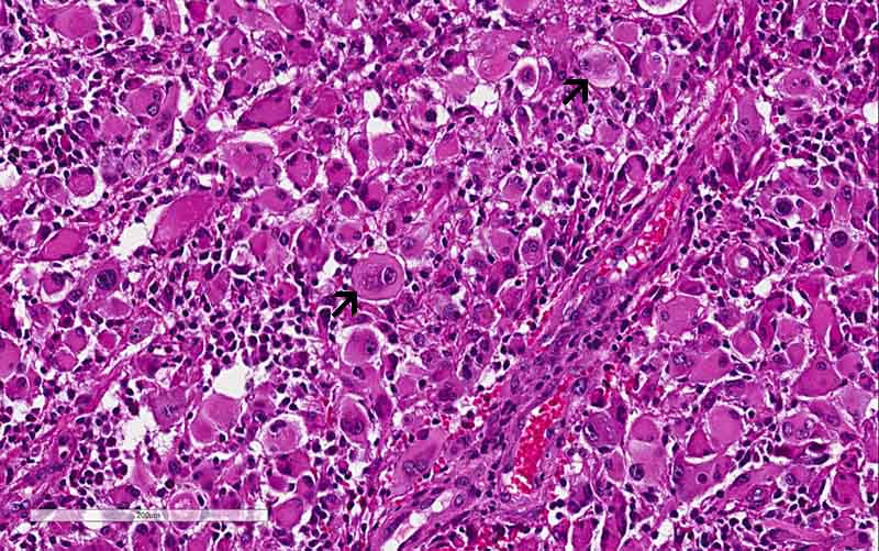 vimentin. Nuclei are large, vesicular, with prominent nucleoli, and are