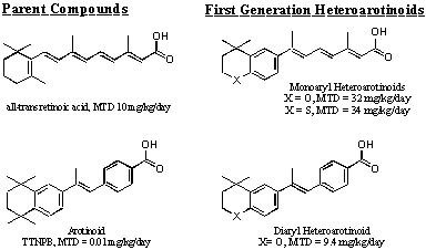 | The structures on the left show that the toxicity of the parent retinoid compounds is reduced by insertion of a heteroarotom (X) in the aryl ring to generate a heteroarotinoid. The MTD is the maximum tolerated dose determine by the dose that causes 10% weight loss after 60 days of administration in mice | ![]() |
