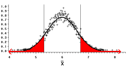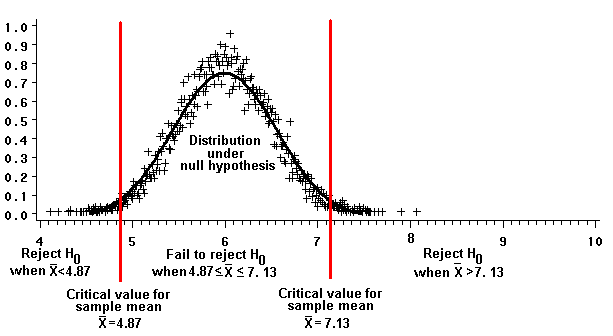 If the null hypothesis (H0: m=6) is true, we are unlikely (the chance is no more than than one in twenty) to draw a sample of n=10 whose mean is less than 4.87 or greater than 7.13. If we draw a sample whose mean is that large or that small, the sample is probably not part of a population with a mean of 6. Therefore, drawing a sample with such a mean justifies rejecting the null hypothesis.
