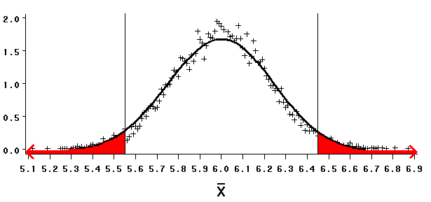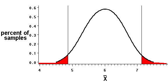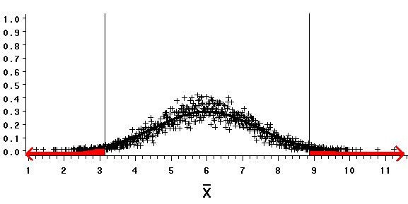 In our current example (Ho: m0=6, s2=2.5), we accepted a type 1 error of 0.05 and calculated two sample means, 4.87 and 7.13, that formed boundaries for the rejection regions.
