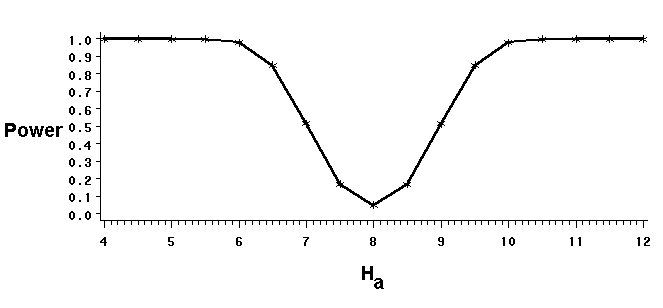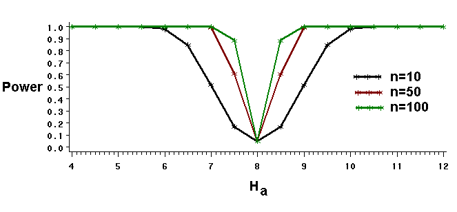 Power curves illustrate the effect on power of varying the alternate hypothesis. The curve illustrates how a sample of ten observations with a variance of 2.5 is quite powerful in correctly rejecting the null hypothesis (in this example, m0=8) when the true mean is less than 6 or greater than 10. The curve also illustrates that the test is not powerful -- it may not reject the null hypothesis even when the true mean differs from m0 -- when the difference is small.