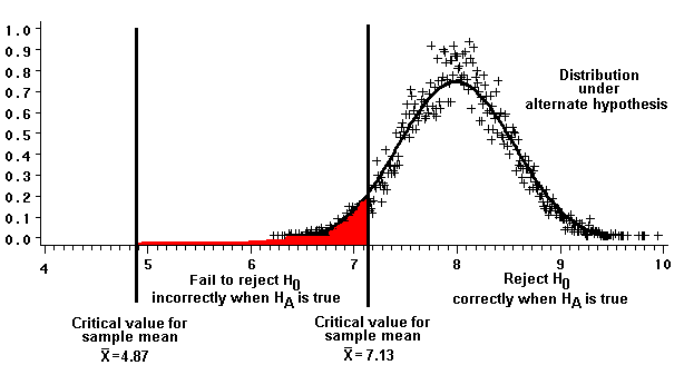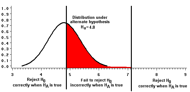 We can specify a different alternative hypothesis whose mean is closer to that of the null: Ha: ma = 4.8; s2=2.5. In this case, when we draw a sample of ten, the sample mean's power to correctly reject the null hypothesis is smaller: