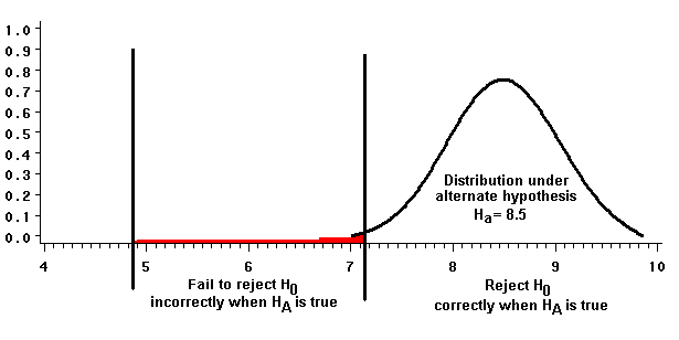 A test's power depends on the specific alternative hypothesis. If we specify Ha such that ma=8.5 and s2=2.5, and draw a sample of ten, the sample mean's power to correctly reject the null is: