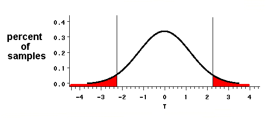 How do we interpret these "rejection regions," whose area equals the probability a? The regions identify t values (on the horizontal axis) that are relatively far from t's expected value of zero. Were we to draw many samples from a population, a (in this case, 5 percent) of the samples would have t-values that are this far from the expected value of zero. According to our knowledge of t distributions, t values that are