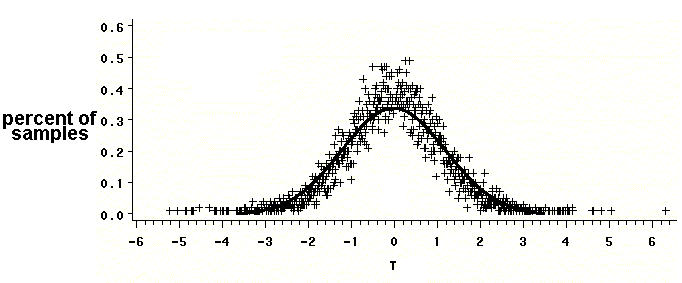 The graph below repeats the previous simulation, in which we drew 10,000 samples, each with ten observations, from a population of measurements that is normally distributed with a mean of 6 and a variance of 2.5. The horizontal axis represents, instead of sample means as in the previous simulation, the t-statistic calculated for each sample on the basis of its specific mean and variance. The graph illustrates that these t-statistics do, in fact, follow a t distribution, certain of whose values are tabulated in many statistics textbooks and online sources, including:
