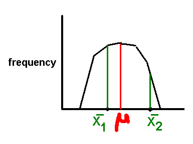 This graph's vertical axis is a "second dimension" that illustrates the results we might obtain were we to draw many samples from a population. The vertical axis summarizes the frequencies with which we might obtain particular values for the sample mean. Common sense suggests that, if we collect a sample not once but many times, the samples' means would typically be close to, and often identical to, the population mean that forms the basis of the null hypothesis. However, we'll also collect samples whose means are smaller (like that of X1) or larger (like that of X2) than the true parameter. We'll occasionally collect a sample whose mean is quite different from the true value.