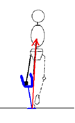 | Typical alignment for below-knee socketAn appropriately short heel lever permits GRF to move anterior of knee joint early in stance phase. |