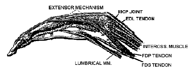 4. the extensor hood surrounds the MP joint laterally, medially, and dorsally, and receives tendinous fibers from the lumbricales and interossei.