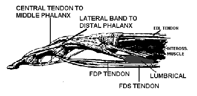 - The central tendon (or "slip") proceeds dorsally to attach to base of middle phalanx, where tension can extend the PIP joint.