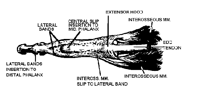 The extensor mechanism is an elaboration of the extensor digitorum comunis (EDC) tendon on the dorsum of each phalanx. The extensor indicis (EI) and the extensor digiti minimi (EDM) insert into the extensor mechanisms of the second and fifth digits, respectively.