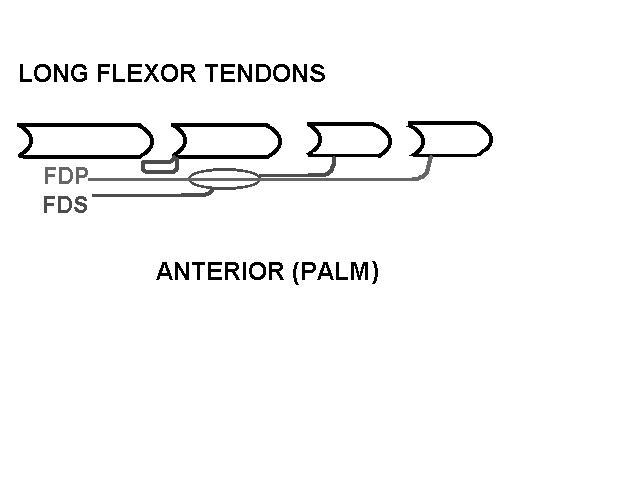 - FDS: flexor digitorum superficialis (the more superficial muscle)