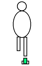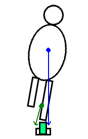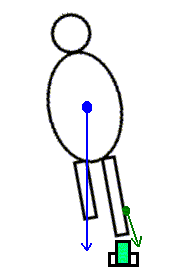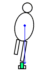 Your body sways anteriorly and posteriorly, and simultaneously sways from side to side. Therefore, gravity's line of application migrates not just anteriorly or posteriorly, but medially or as well. The medial-lateral movement causes gravity's line of application to cross to either side of the subtalar joint's axis. Because standing is a closed chain activity, the calcaneus is relatively stable and the talus and lower leg are relatively mobile. The frontal plane figure depicts the stable calcaneus in green.