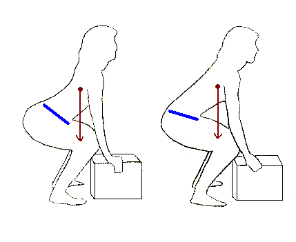 The vector construction illustrates a "trade-off" that therapists accept when they teach a person to use either of the two strategies for the squat lift.