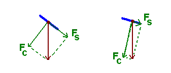 Blue lines illustrate the L5-S1 joint surface's orientation in the two pelvic postures.Maroon vectors represent gravity's force on the body (but not the additional weight that the person is lifting) that is superincumbent to the L5-S1 intervertebral joint. Below, gravity's effect on the joint surface is compared through resolution of the force's vector into compression (Fc) and shear (Fs) component vectors. |
