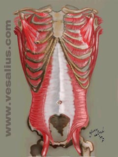 Viewed in the frontal plane, the muscle's lines of application have at best very short moment arms with regard to the IVJ antero-posterior axes. In fact, individual fibers proceed from their lateral attachments horizontally to the linea alba in such a way that they do not truly "cross" any intervertebral joints; no fiber begins, for instance, at the level of L4 and ends at the level of L3 or L5. This observation leads us to predict that the muscle has little effect on lateral flexion (sidebending).