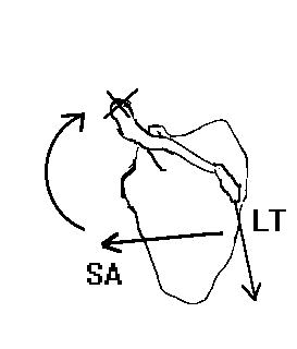 | Once tension in the costoclavicular ligament prevents further elevation of the clavicle at the sternoclavicular joint, the axis for scapular rotation moves to the acromioclavicular (AC) joint.The "X" illustrates the AC joint's antero-posterior axis. Around this axis, the serratus anterior (SA) and the lower trapezius (LT) produce upward rotation moments. |