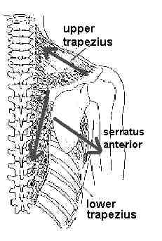 | During the early phase of upward rotation, the scapula and the clavicle move together around an axis through the sternoclavicular (SC) joint, the only joint where the scapula and shoulder girdle attach to the axial skeleton. The SC joint's antero-posterior (AP) axis is somewhat oblique and passes near the base of the scapular spine.Around this axis, serratus anterior (SA) and upper trapezius (UT) produce upward rotation moments. |