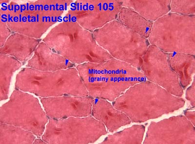 Examine the skeletal muscle of this slide and its histological features. Again, try to resolve mitochondria .