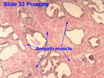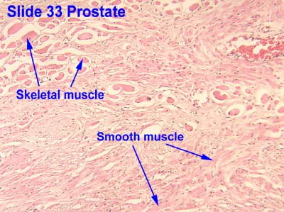 In this section smooth muscle and skeletal muscle are both present. Compare and contrast the two types of muscle. The smooth muscle is present as an integral part of the prostate surrounding the islands of epithelium and the skeletal muscle is present off to one side of the tissue section (apparently a small portion of one of the skeletal muscles in the lower abdominal wall). Most of the skeletal muscle cells (commonly referred to as skeletal muscle fibers) are cross sectioned . Note the position of the nuclei in the cross sectioned fibers as well as the few longitudinally sectioned fibers present in the slide. Note the delicate endomysium .