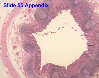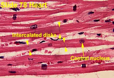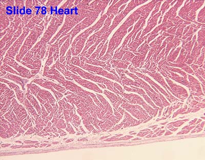 Note the acidophilic fibers that change direction frequently. Observes the striations present in cardiac muscle. Also observe fiber bundles which are cut in longitudinal , oblique and transverse section. Observe the centrally located nuclei of cardiac muscle. Locate a large area of longitudinally sectioned fibers and note: