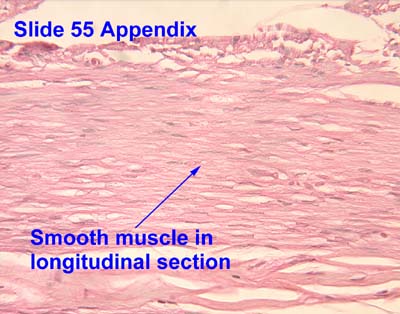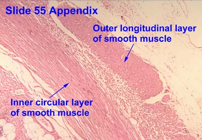 Find the smooth muscle in the outer perimeter of this section. It is represented here as two layers, an outer longitudinally oriented layer and an inner circularly arranged layer . You can readily observe the appearance of smooth muscle cells in cross and longitudinal profiles .