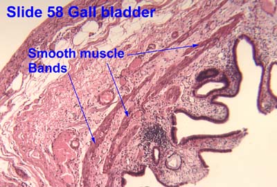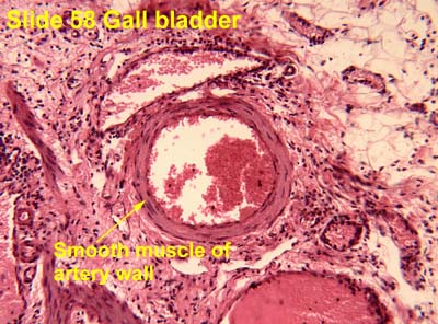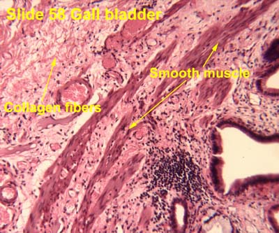 Smooth muscle is shown here in discrete bands beneath the epithelium. It is also present in the wall of several arteries present. Again observe the difference between the smooth muscle present and the collagen fibers which are also represented.