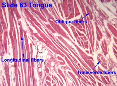 Reinforce your ability to recognize the special histological features of skeletal muscle. Note striations , nuclei , and fiber arrangement . Note the characteristic three planes of skeletal muscle in the tongue.