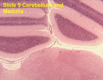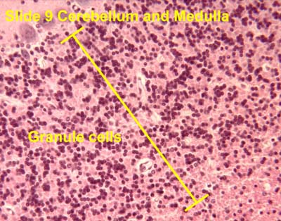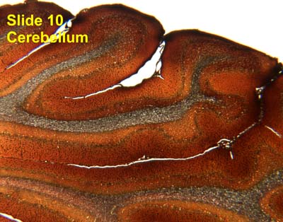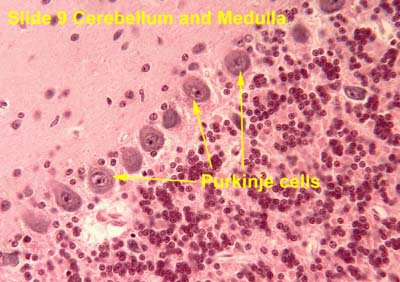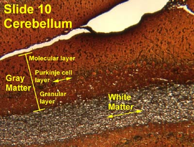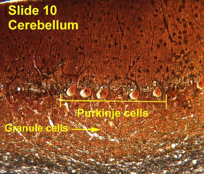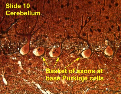 This slide shows a different staining technique. The same histologic features present in Slide 9 can be studied. For reinforcement, again find the layers of the cerebellar cortex , Purkinje cells , and granule cells . In addition, note that the Purkinje cells are surrounded by a "basket" of axons (axons and dendrites stain black in this slide). These axons contact the Purkinje cells forming axosomatic synapses.