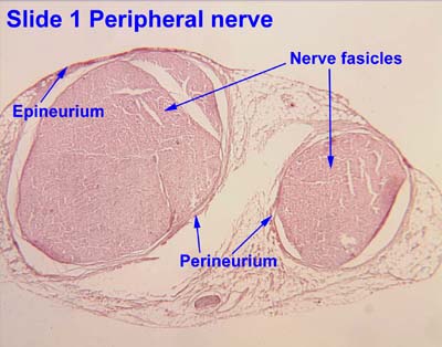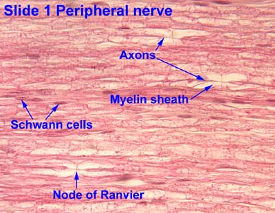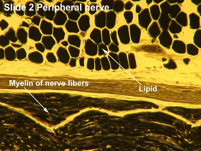 In the cross section, note that the peripheral nerve contains at least two nerve fasicles separated from each other by connective tissue containing fat cells. Identify epineurium , perineurium , and endoneurium . In the longitudinal section, notice the regular parallel orientation of myelinated nerve cell processes and connective tissue in longitudinal section. At high magnification, note the elongate nuclei of Schwann cells . Also find axons , myelin sheaths (of Schwann), and nodes of Ranvier .