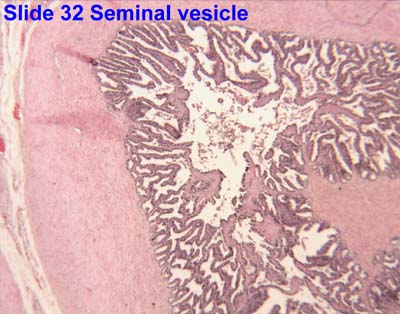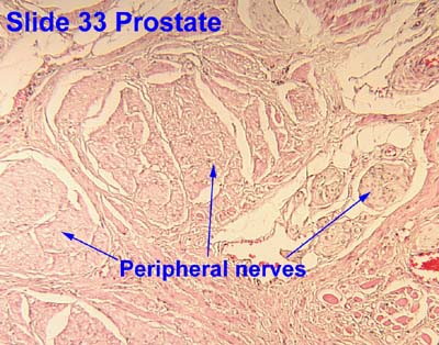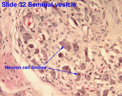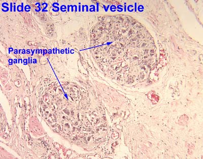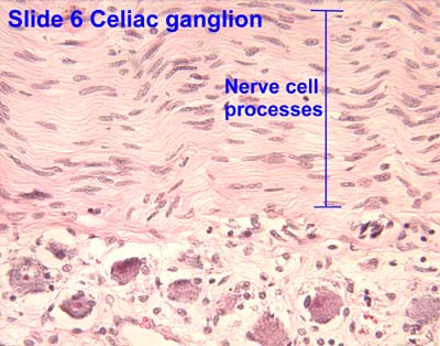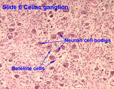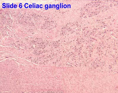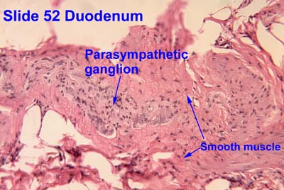 Find one or more small, parasympathetic ganglia located within the connective tissue of the gland. One to several neuron cell bodies may be present in these small ganglia. Note the similarity to the celiac ganglion. Parasympathetic ganglia are often located near or within the organ that they innervate. Therefore, the post-synaptic (post-ganglionic) efferent nerve fibers tend to be shorter than those from neurons located within sympathetic ganglia. Also look for small peripheral nerves in the wall of this organ.