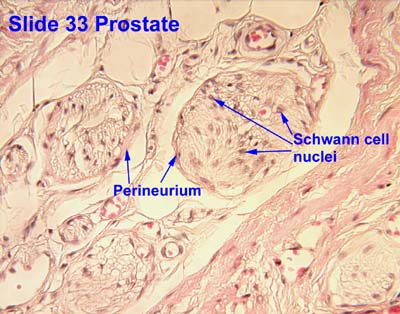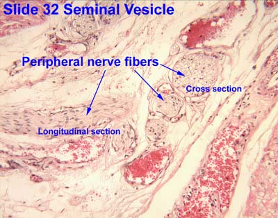 Find the small peripheral nerves located in the wall of this organ. The small nerves are most easily found at the periphery of the organ and running near blood vessels. They are generally surrounded by an intensely stained perineurium . The nerves have a wavy appearance and have many Schwann cell nuclei among the nerve fibers.