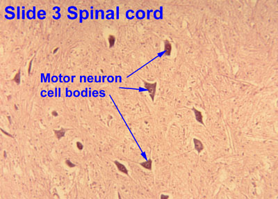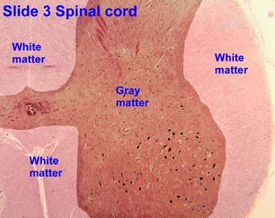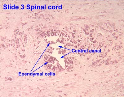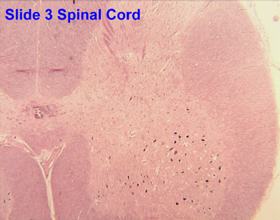 Note the H-shaped central gray matter (containing many neurons) and the surrounding white matter . The gray matter is organized as posterior (dorsal) horns and anterior (ventral) horns . Also note the pia mater that is closely adherent to the spinal cord. Identify the ependymal cells surrounding the central canal . Observe the large neuron cell bodies (somata or perikarya) in the ventral horn and the much smaller cell bodies of the dorsal horns. Identify the neuropil (the area between neuron somata composed principally of an intermingling of axons, dendrites, and processes of neuroglial cells). Identify the neural processes ( axon and dendrites ) and axon hillock of a large multipolar motoneuron. Observe the large number of nuclei of other (non-neuronal) cells within both gray and white matter. Although it is not possible to identify each cell type with certainty on this routine-stained section, most of these represent the nuclei of neuroglial cells (astrocytes, oligodendroglia, and microglia). Examine the white matter at high magnification and note nerve cell processes surrounded by empty myelin spaces and the nuclei of neuroglial cells .