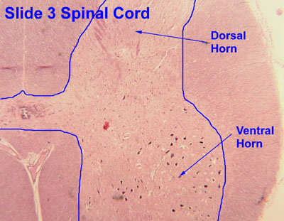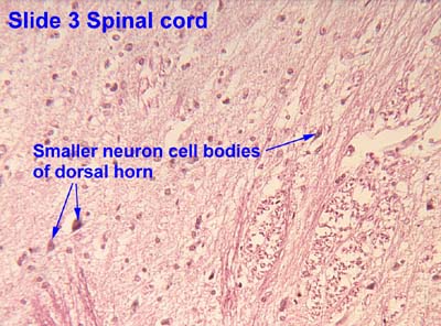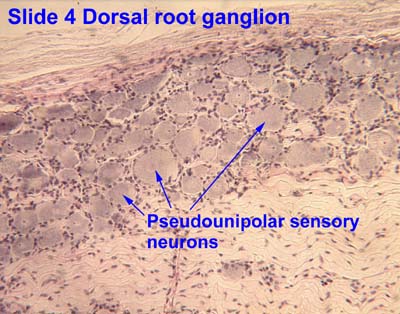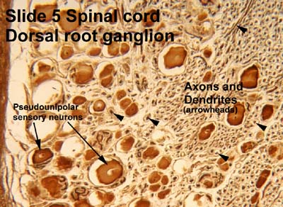 In this slide, locate the dorsal root ganglion outside the spinal cord. Myelin is unstained and axons and dendrites are black. Satellite and Schwann cells are NOT obviously evident. Compare the size, shape and arrangement of sensory neurons in this slide with those seen in Slide 4 .